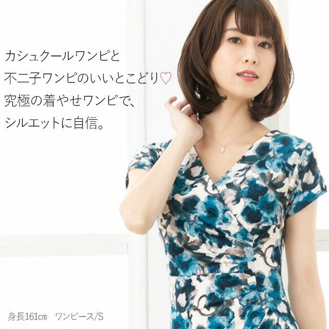 不二子カシュクール:カメリア クラッシーブルー ◆opc7-0001 カシュクールワンピース ジャージー レディース 着やせ 上品 半袖 膝丈 タイトワンピース 花柄 エレガント S-M-L-XL トールサイズ 大きいサイズ 30代 40代 大人 上品 きれいめ 春夏/秋